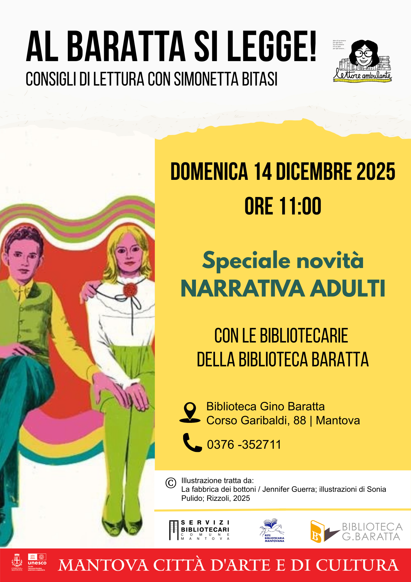 L’incontro, a ingresso libero e gratuito, si svolgerà presso la Biblioteca Gino Baratta, Corso Garibaldi 88, Mantova.