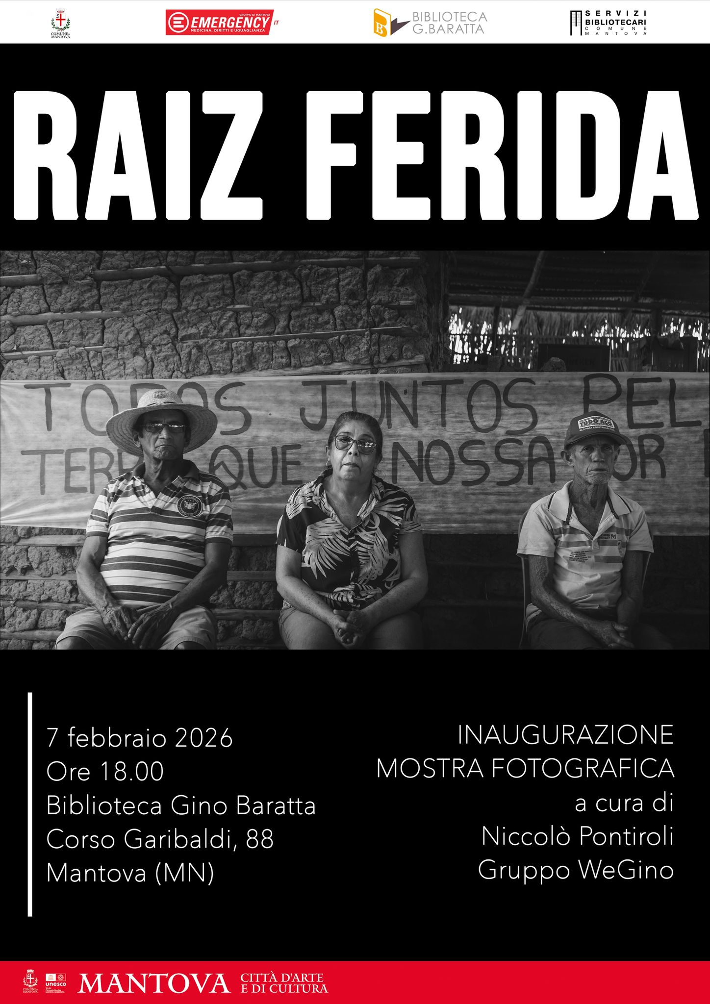 mostra raiz feridaSabato 7 febbraio 2026 alle ore 18.00, nella sala “Peppino Impastato”, la Biblioteca Gino Baratta inaugura la mostra fotografica “Raiz ferida”, progetto espositivo a cura di Niccolò Pontiroli e del gruppo WeGino, visitabile fino al 21 febbraio 2026.