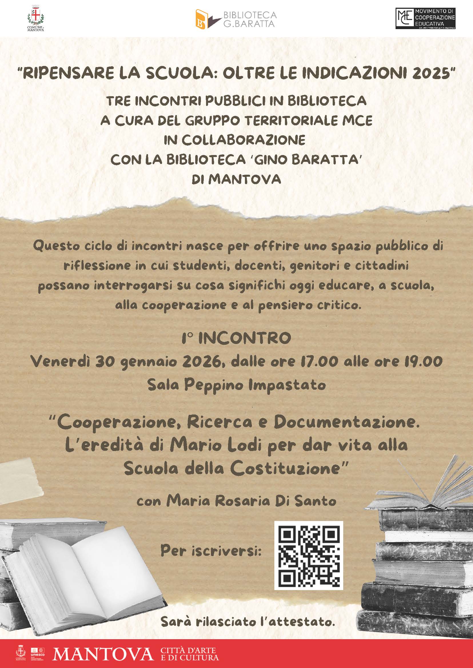 Venerdì 30 gennaio 2026 alle ore 17:00, in sala "Peppino Impastato", la Biblioteca Gino Baratta, in collaborazione con il Gruppo Territoriale MCE – Movimento di Cooperazione Educativa, ospiterà il primo appuntamento del ciclo di incontri “Ripensare la scuola: oltre le Indicazioni 2025”, un percorso di riflessione aperto alla cittadinanza sui temi dell’educazione, della cooperazione e del pensiero critico.